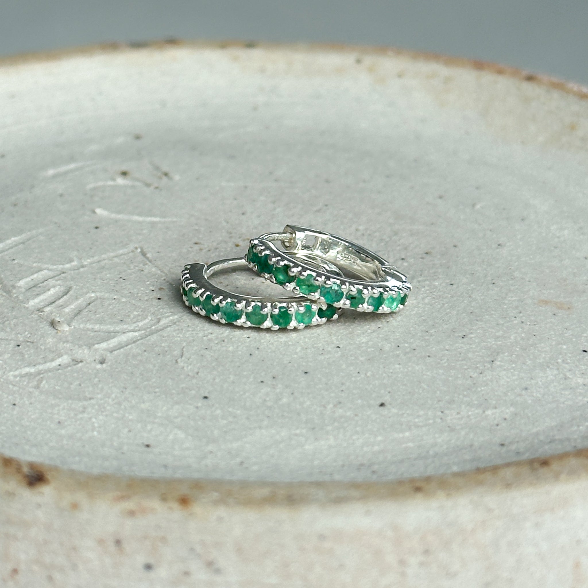 Gorgeous handmade huggie earrings crafted in sterling silver, featuring emerald stones.